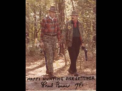 I thanked him a just a few years ago for not running me off as a kid when I would bug Fred at shows. He could have and yet never did. As a matter of fact, I still have an envelope of photos Dick sent me of Fred and I at an event. He mailed them to me a few weeks after the show. During the event, my parent's and I had attended a big fancy private party Fred hosted in Atlanta during the SHOT SHOW. We stayed till the end and walked down the hall as Fred and Dick left the party. I snapped a photo of the two of them walking down the hall together, the hero and his trusty sidekick. Now days I view them both as heroes. I see that it was Dick who often was behind the scenes helping steer the media and image of Fred and Bear Archery.