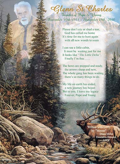 “Glenn St. Charles will be remembered by many as a talented bowyer and founder of the Pope and Young Club. Rightfully so. But for his close friends and family, he will be fondly recalled a man who accomplished much more during a long and active lifetime. Father and father figure; fierce advocate and tireless defender of the sport he loved; pioneer bowhunter and visionary leader; outspoken conservationist; promoter of fair chase hunting; loyal friend and wise mentor; without question, Glenn St. Charles left his indelible mark on archery and bowhunting. He will be missed, but his place in our sport’s rich history is secure.”