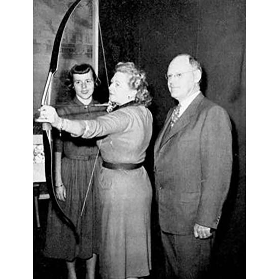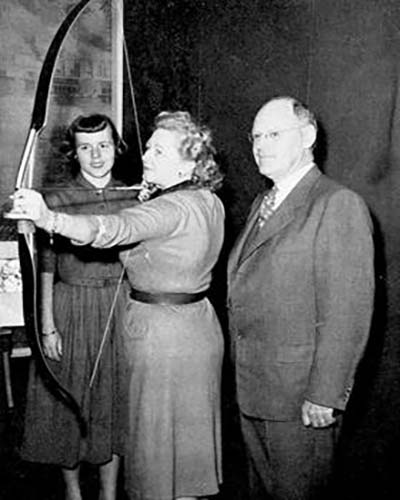 In 1956 the Robin Hood television series, sponsored by Wild Root, agreed to coordinate with the Robin Hood National Archery Tournament organized by Myrtle and Eddie for boys and girls under the age of 14. Over $1 million of television coverage was provided for education and tournaments in all 50 states, involved coverage by 86 of the then 132 ABC television stations, and involved over 25,000 children! Ultimately, this Robin Hood instructional and competitive program evolved into the present Junior Olympic Archery Development Program (JOAD). She gave archery demonstrations on CBS and NBC sports telecasts and other programs, including children’s programs “On the Carousel” with Paul Tripp, the “Tex and Jinx Show”, and “Johnny Carson’s “Who Do You Trust”.