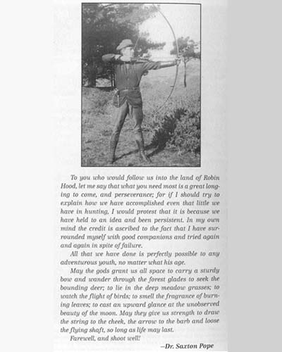 Unlike Maurice and Will H. Thompson, who pioneered and popularized archery in the late 1800s, Pope was both an accomplished bowyer and hunting archer, making all his bows, arrows and accessories. Dr. Saxton T. Pope contracted pneumonia soon after returning from Africa and passed away in 1926.